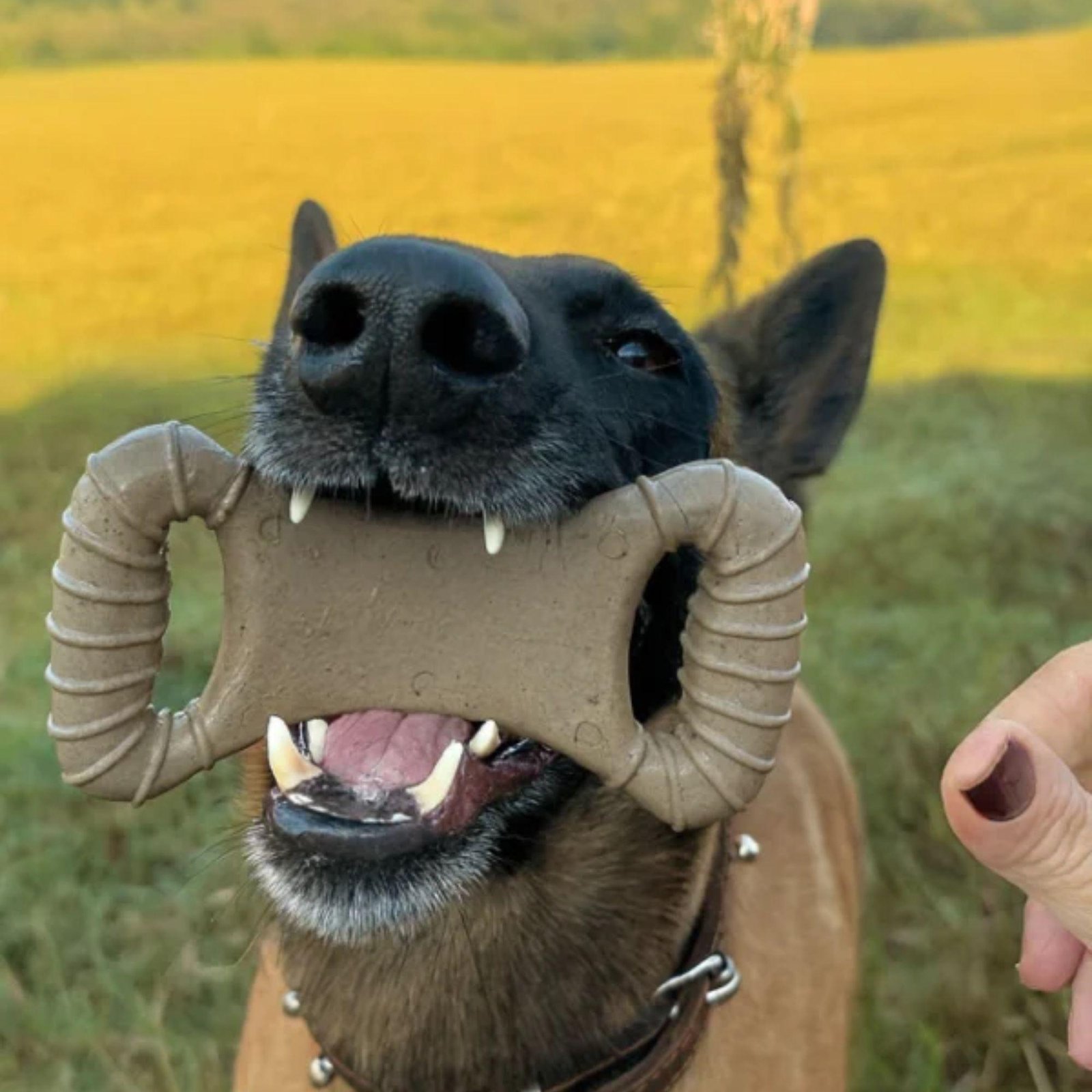 Mordedor natural desenvolvido para cães de porte médio e grande com mordidas moderadas, ou para aqueles que não se adaptam a brinquedos muito duros e difíceis de roer.