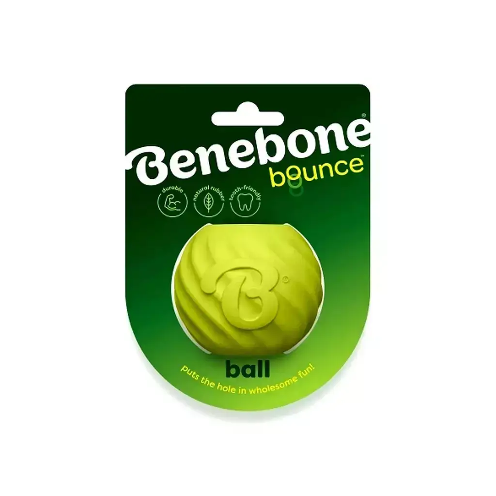 O Benebone Bounce Ball é feito de borracha natural e indicado para cães de pequeno a médio porte. Pode ser recheado com alimento natural ou petiscos pastosos como pasta de amendoim, tornando a brincadeira de bola ainda mais atrativa e estimulante.