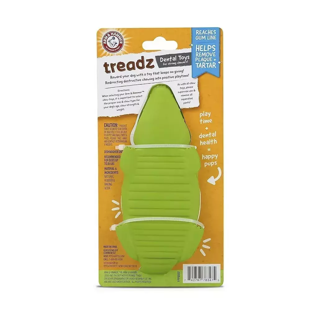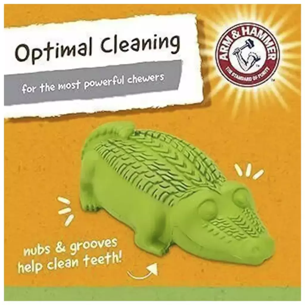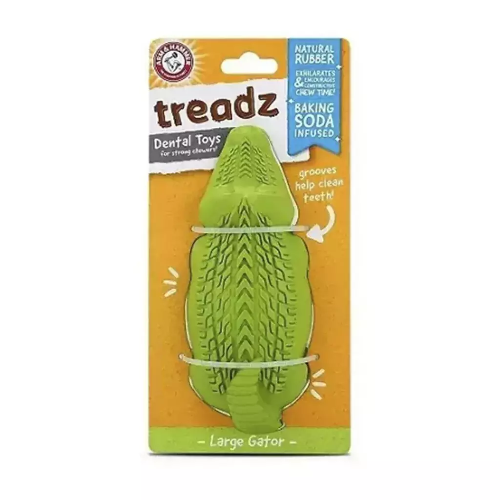 O Super Treadz Jacaré Grande da Arm & Hammer é o brinquedo ideal para cães com mandíbulas fortes. Produzido em borracha natural super resistente, ele oferece diversão e, ao mesmo tempo, contribui para a higiene bucal do seu pet, graças à infusão de bicarbonato de sódio.