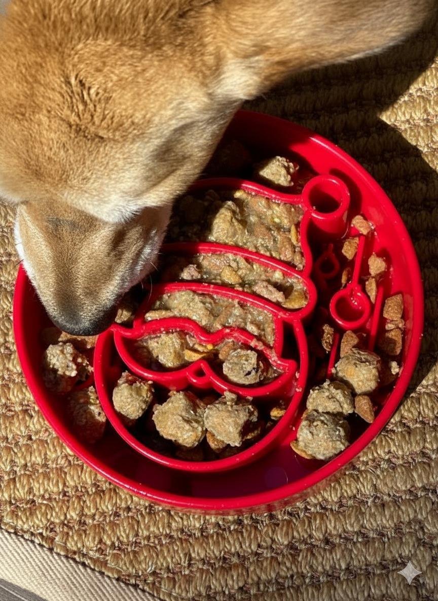 O Comedouro Lento Papai Noel resolve esse problema com um design segmentado e desafiador, que estimula o raciocínio e desacelera o ritmo das refeições.