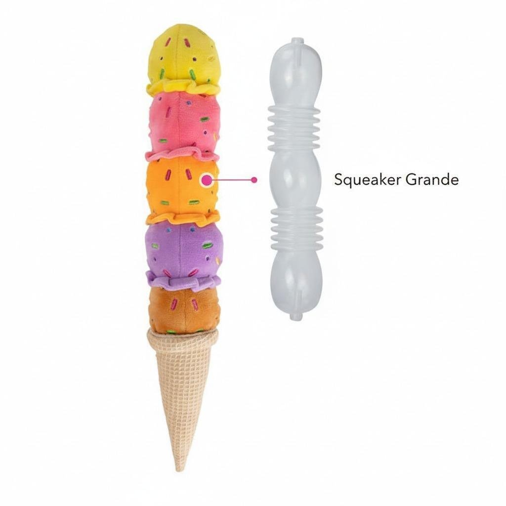 Seu formato divertido de sorvete chama a atenção, enquanto o simulador de traqueia interno emite som ao ser pressionado, incentivando a interação, o gasto de energia e o enriquecimento ambiental.